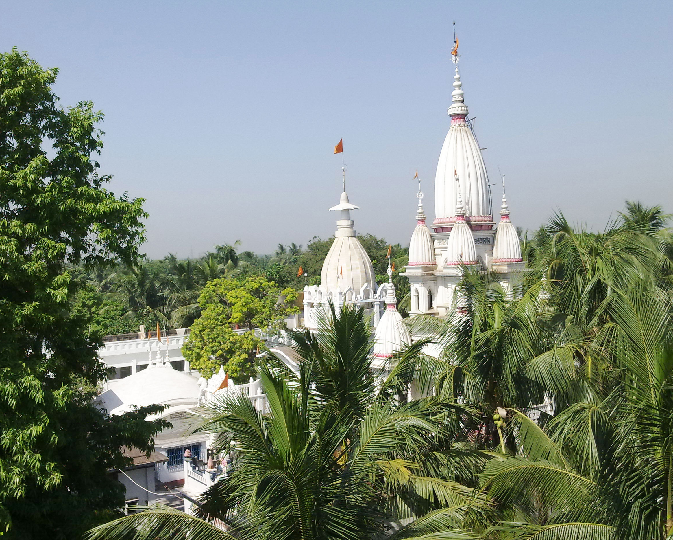 Coming to Sri Koladwip, there is one more profound thing that must be said: within Gupta Govardhan stands our beloved Sri Chaitanya Saraswat Math. Our Param Gurudev, Pujyapad Om Vishnupad Srila Bhakti Raksak Sridhar Dev-Goswami Maharaj, came here in 1941. At first, he stayed in a small kutir (hut) on the bank of the Ganges – his younger brother Mani Babu would give him ten rupees per month, and Srila Sridhar Maharaj lived there alone, supporting himself with that money. He did not go begging and did not particularly preach. Shortly after that, Sripad Sakhi Charan Prabhu offered him, ‘If you choose some land, I will give you money to purchase it.’ Remembering the glory of the aparadha-bhanjanera pat and Sri Gupta Govardhan, Srila Sridhar Dev-Goswami Maharaj then choose this land in Sri Kolerganj (where Sri Chaitanya Saraswat Math stands to this day), and the same year, on the holy day of Sri Jagannathdev’s Ratha-Yatra, he entered the new place and started living there. He named his temple ‘Sri Chaitanya Saraswat Math’. Although we belong to Brahma-Madhva-Gaudiya sampradaya, the conception of the holy raganuga-bhakti (spontaneous loving devotion) actually first manifested through Srila Madhavendra Puripad – he is the seed of the spout of divine love; and we can see that by the influence of Sri Chaitanya Mahaprabhu, this seed has become transformed into a beautiful, full-fledged tree. Remembering this core identity of our sampradaya, Srila Sridhar Maharaj included the words ‘Sri Chaitanya’ in the name of his temple. Also, the name of Srila Sridhar Maharaj’s gurudev is Om Visnupad Bhagavan Srila Bhaktisiddhanta Saraswati Thakur Prabhupad – therefore, to include the entire identity of our sampradaya, from the very beginning until the end, Srila Sridhar Dev-Goswami Maharaj named his temple and mission ‘Sri Chaitanya Saraswat Math’. At first, Sri Chaitanya Saraswat Math’s land was just one acre (almost three bighas) – at that time, there were not so many trees, gardens or great buildings. There were just three mango trees, two guava trees and a bamboo grove. However, having purchased this land, the first thing Srila Sridhar Dev-Goswami Maharaj did was to go to a bamboo garden and personally choose a very long and expensive bamboo pole – he brought that pole to the temple and established it at the very place where the main temple stands now. Raising a flag atop the pole, he proclaimed: