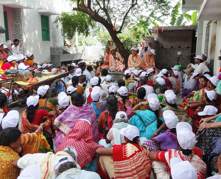gaura-vrajasrita-asesair vaisnavair vandya-vigraham Gaura-vraja-asrita-asesair vaisnavair vandya-vigraha. All Vaishnavs who have taken shelter at the holy lotus feet of Sri Krishna in Vraja and Sri Gauranga Mahaprabhu in Nabadwip offer their obeisances at the holy lotus feet of Srila Jagannath Das Babaji Maharaj. He is the supremely worshippable Deity, the embodiment of shelter. Jagannatha-prabhum vande premabdhim vrddha-vaisnavam. We eternally offer our obeisances at the holy lotus feet of this supremely worshippable senior Vaishnav Thakur, who is floating in the ocean of transcendental love. You know that Srila Jagannath Das Babaji Maharaj was a siddha-mahapurusa. Receiving an inspiration from Srimati Radharani that all the Radha Kunda and Vrindavan pastimes of Krishna now exist in Sri Nabadwip Dham – driven by this pull – Srila Babaji Maharaj came here despite his old age and settled in a small cottage. You have heard that when Srila Jagannath Das Babaji Maharaj was 137 years old, Srila Bhaktivinod Thakur came here and requested him to come with him to Mayapur to confirm the discovery of Sriman Mahaprabhu’s birthplace. Coming to the supreme abode of Yogapith, Babaji Maharaj jumped out of his basket and began to dance, ‘Hari bol! I have found it! This is Prabhu’s birthplace! This is Yogapith!’ We have heard something about the incredible character of Srila Jagannath Das Babaji Maharaj from the holy mouths of Sri Guru and Vaishnavs, and we should learn from his pastimes. Many cook for their gurudev and then come to gurudev and ask him, ‘Gurudev, please give me your prasad.’ This is what sahajiyas do (they distribute their prasad to others). But if this is a genuine guru, he will get irritated to hear this – he would never want to give his remnants to anyone. If you want to get prasad, you must do it secretly. When gurudev finishes taking prasad, and if he has left anything on his plate, you can quietly take a handful later, but there is no question of coming in front of your guru and asking him for it. Many think, ‘I want to get some prasad leftovers of my guru, so I will invite him to my house.’ They feed their guru forcefully just to get his prasad. This is not Vaishnav behaviour. One time, a lady from Dhatrigram (a village near Kalna) invited Srila Jagannath Das Babaji Maharaj to her house. Babaji Maharaj had a servitor, Bihari Das. The lady told Bihari Das, ‘I am inviting you and your Master (your gurudev). I want to cook for you and give you prasad at my house.’ Bihari Das agreed, ‘All right, I will ask Babaji Maharaj, and if he agrees, I will tell you the date when he will come, then you can arrange it.’ Then, Bihari Das asked Babaji Maharaj, ‘Babaji Maharaj, one honourable lady, an elderly widow, came the other day. She was asking if you could come to her house. She wants to cook, offer some bhog and give you prasad. Will you go there?’ ‘All right, I will go,’ Babaji Maharaj said. ‘Can you say which day you can go?’ ‘You can arrange some date, and I will come.’ Then, Bihari Das chose the date and informed the lady about it. When the day came, Babaji Maharaj set off to her house on foot (there were no trains in those days). When they finally arrived at that house, the old lady said to Bihari Das, ‘I have already finished cooking. Please offer the bhog.’ Bihari Das offered the bhog, and the lady said, ‘Come, sit down, I will serve the prasadam to you both.’ She placed two banana leaves on the ground and served them prasad. Babaji Maharaj ate whatever she had given him, wiping the plate and not leaving a trace of prasadam. The lady thought, ‘It was so hard to invite Babaji Maharaj… I wanted to take his prasadam, but I see that he has not left any remnants! Let me feed him something more then!’ With this in mind, she tried to give Babaji Maharaj more, but Babaji Maharaj refused, ‘No, no, it is enough, not necessary! I have finished, not necessary to give anything more. I have eaten, I cannot eat more.’ But the lady kept insisting, ‘No, no, take more!’ In the end, she forcefully gave him more prasad – subji, vegetables, rice, and so on. Srila Babaji Maharaj understood what was happening and was displeased at heart, ‘You are forcing me to eat because you yourself want to take prasad! I have understood what is on your mind.’ Without saying a word, Srila Babaji Maharaj again ate whatever she gave him – along with the plate! Seeing that Babaji Maharaj had eaten the plate(!), the lady exclaimed, ‘Gosh!’ And Bihari Das was horrified, too, ‘Gosh, I have made such a big offence! Because of me, there is so much austerity for my Master! I will never accept such invitations again!’ As for Babaji Maharaj, he did not say anything. Such was Srila Jagannath Das Babaji Maharaj. There is also another story. When Babaji Maharaj and Bihari Das were, perhaps, going to the house of that old lady, a rich man saw them on the road and thought, ‘Oh, this sadhu is so poor – he is walking barefoot, his clothes are all torn… Let me give him some money – at least he can buy himself some clothes.’ (Actually, the man gave Babaji Maharaj money because he was proud of his wealth and riches.) Babaji Maharaj took the money and continued his way. A while later, having walked some three–four kilometres, he suddenly ordered Bihari Das, ‘Turn back. Let’s go back.’ Bihari Das was surprised, ‘Why? Are you not going to that lady’s house?’ ‘I am, but first take me to the house of the man who gave this money.’ ‘But why?’ ‘Go, go. Turn back.’ Bihari Das brought Babaji Maharaj to the house of that man – a big three-storey house. They saw the man sitting on the roof of the house. Babaji Maharaj told Bihari Das to ask him to come downstairs (Babaji Maharaj was old and spoke softly; he could not shout). Bihari Das shouted to the man, ‘Sir, are you home?’ ‘I am. What is it?’ the man asked from the roof. 