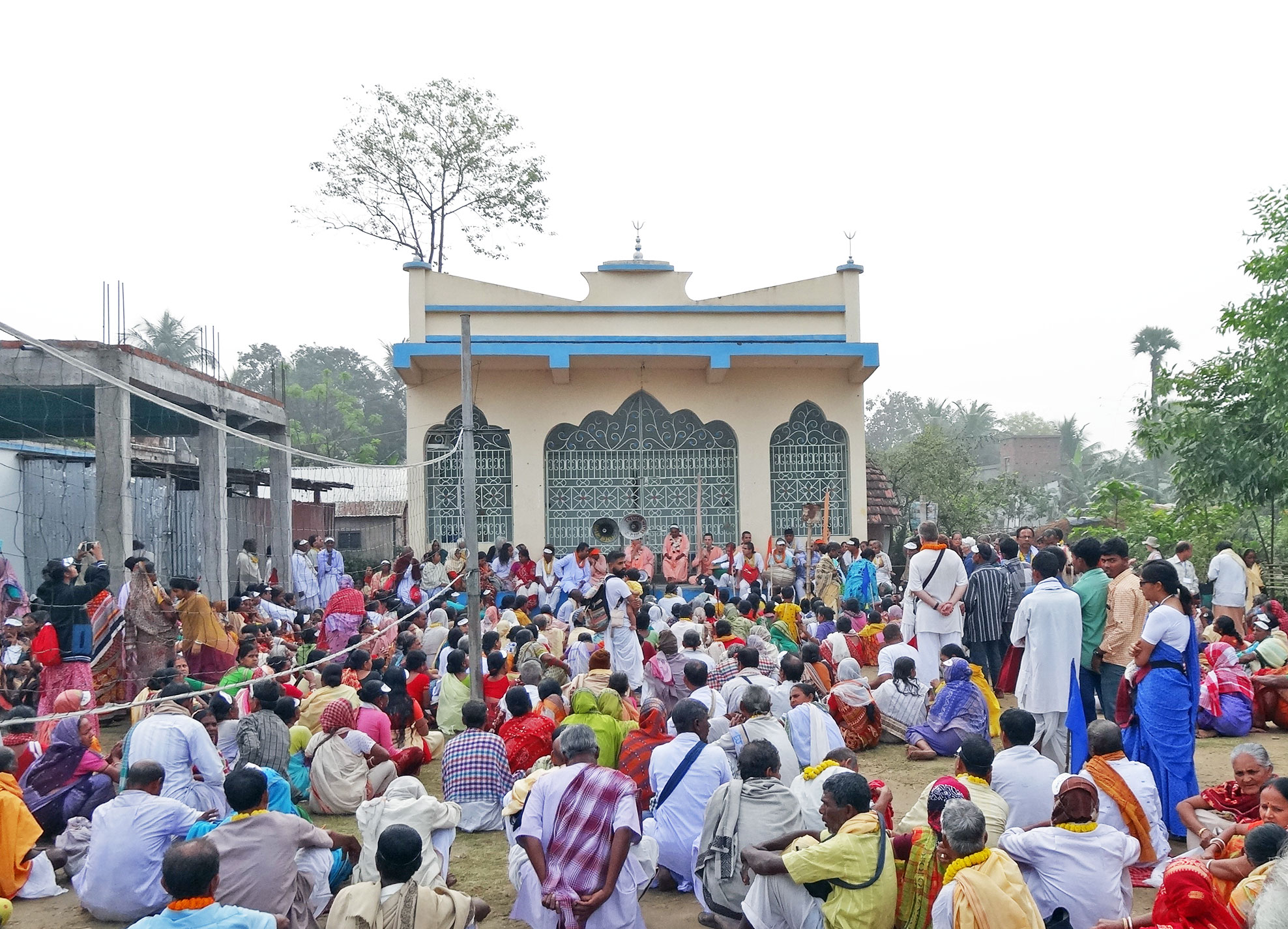 We usually visit the second part of Sri Koladwip (the western side) during the fourth day of Sri Nabadwip Dham parikrama. As each year, this year, too, by the mercy of Sri Gurupadpadma, we have entered Sri Koladwip on our last day and have now come to Sri Samudragad, where Sri Dvaraka Dham and Gangasagar reside eternally. In the previous age, in this area there lived a king called Raja Sri Samudrasen. Although he was a great king, he was also an exalted devotee of Lord Krishna – he always thought about Krishna and knew nothing else except the Lord. One day, Bhimasen came here to conquer the kingdom. He and his soldiers had surrounded Samudragad, but Raja Samudrasen was very intelligent: he knew that Krishna was the master and close friend of the Pandavas and if any of the Pandavas got into danger, Krishna would definitely come to rescue them. So, the king thought, ‘If I scare Bhima, the Lord will hear his prayer and come to my land, and this poor and fallen soul will be able to get His darshan.’ In this way, thinking about the Lord, the king brought his elephants, horses and soldiers, and a great battle started. Eventually, the king’s plan was successful: as the battle went on and on, Bhima finally became very afraid; seeing no way out, he prayed to the lotus feet of Krishna, ‘Prabhu, please protect me! I can neither win this battle nor lose it! If I lose it, I will not be able to tolerate such great humiliation.’ Lord Sri Krishna, the master of the Pandavas, heard Bhima’s cry and personally came to the battlefield. Then, something wondrous happened. King Sri Samudrasen got the darshan of Lord Sri Krishna’s form of exquisite beauty – he could see nothing except the Lord. At the sight of Krishna’s beauty, the king became overwhelmed with divine love and was on the verge of fainting. The king then prayed to the Supreme Lord, ‘O Lord, You are Krishna, the Lord of the entire world, Jagannath, You are the rescuer of the fallen – seeing this fallen soul, You have come to me! The whole world is chanting Your glories, and now that I have seen You with my own eyes, my dream has been fulfilled. At the same time, O Lord, I have promised that I will not go anywhere from here until You come to this Nabadwip Dham. O merciful One! Have You come to fulfil my promise? My hidden aspiration is to behold You as Gauranga.’ Saying this, the king suddenly first saw Vrindavan pastimes of Radha and Krishna and then the mysterious form of Rasaraj-Mahabhav Gauranga Mahaprabhu: Nimai Visvambhar was chanting and dancing together with His devotees in maha-sankirtan. After a while, the Lord disappeared. When everything became calm again, the king began to cry. In the meantime, Bhimasen saw the king crying (he could not understand why because he had not seen the Lord) and was astonished. He thought that the king was crying out of fear. So, he again started fighting, and this time the king let him easily win the battle. Bhima got the tribute from the king and went away, feeling pleased with himself. From then on, the whole world chants the glories of Bhima calling him ‘digvijay’, the conqueror of all directions. Samudragad (Samudragarh) is situated near the border of Sri Nabadwip Dham, and even Lord Brahma himself does not know its glory. One time, Samudra (the Ocean) came here and, taking shelter of Ganga Devi, started serving devotees. Ganga Devi told the ocean, ‘Prabhu, very soon my Lord will come and stay on your shore.’ ‘O Devi!’ replied the ocean. ‘Can I tell you something? Sachinandan Gaura-hari never leaves Nabadwip. Even if He stays on my shore for a few days, He actually always stays in Nadia in an unmanifest way. All the Vedas say that the eternal pastimes of Mahaprabhu continue eternally in Sri Nabadwip Dham. O Devi! I will stay here, in your shelter.’ Saying this, the ocean stayed in Nabadwip Dham and continues sitting here, in Samudragad, to this day, meditating on the eternal pastimes of Gauranga Mahaprabhu. Sriman Nityananda Prabhu told Srila Jiva Goswami Prabhu about the glory of this place, and by the mercy of Srila Bhaktivinod Thakur, we get to know about all this from Sri Nabadwip-dham-mahatmya. This is our greatest fortune.