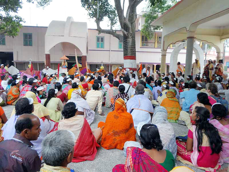 Когда Махапрабху завершил свои деяния, в мире остались Шри Рупа Госвами, Шрила Санатана Госвами, а после них — Шрила Нароттам Дас Тхакур, Ачарья Шринивас, Шри Шьямананда Прабху, Шрила Джива Госвами. Они продолжали расширять проповедь и семью Махапрабху. После того как они все ушли, та религия, которую принёс Махапрабху, потекла в другом русле: в мире появилось множество сампрадай, проповедующих ложные доктрины (аул, баул, картабхаджа, нера, дарвеша, саи, сахаджия, сакхибекхи, смарта, джата-госаи, атибари, чурадхари, гауранга-нагари и т.д.), в результате чего люди начали критиковать и ненавидеть сампрадаю вайшнавов. Много лет спустя, в 1838 году, в деревне Ула (Биранагар, район Надия) появился на свет Шрила Бхактивинод Тхакур. Работая государственным чиновником, он собрал и прочёл множество писаний, из которых он узнал о том, что проповедовал Махапрабху. Он увидел, что всё то, что проповедовалось в мире, было заблуждением: вместо учения Махапрабху множество лже-сампрадай распространяли ложные учения. Видя прискорбное положение этого мира, Шрила Бхактивинод Тхакур обратился к Бимале Деви с молитвой: «О Деви! Пожалуйста, пришли того, кто сможет проповедовать истинное учение Махапрабху в этом мире!» Вскоре после этого в Шри Пури-дхаме появился на свет Шрила Прабхупада. Позже он жил вместе со Шрилой Бхактивинод Тхакуром в Шри Годрумдвипе (в Шри Навадвип-дхаме), откуда они открыли храм в Йогапитхе, а вскоре после этого храм, Шри Чайтанья Матх, где мы сейчас находимся. Из этого храма Шрила Прабхупада проповедовал учение Махапрабху (чистое учение о преданности: шуддха-бхакти-сиддханта-вани) по всему миру. Таким образом мы в бесконечном долгу перед Шрилой Бхактивинодом Тхакуром. Шрила Прабхупада являл свои проявленные деяния в этом мире на протяжении всего лишь шестидесяти четырёх лет, но за эти шестьдесят четыре года он открыл шестьдесят четыре храма (по большей части по всей Индии и в нескольких местах за границей). Шри Чайтанья Матх, где мы сейчас находимся, – это главный храм (Акар Матх-радж) всех храмов гаудия вайшнавов. Прежде чем открыть Чайтанья Матх, Шрила Прабхупада жил в Маяпуре. Здесь он принял обет повторить миллиард Святых Имен, на что у него ушло четыре года и четыре месяца. Он проводил весь день лишь повторяя Святое Имя, пообещав: «Я повторю миллиард Святых Имен, а затем начну проповедовать учение Махапрабху». Когда Шрила Прабхупад завершил свой обет, Шри Шри Гуру Гауранга Гандхарва Гиридхари (Шримати Радхарани) пришли к нему и сказали: «О Наяна Манджари, проповедуй в этом мире учение Гауранги Махапрабху, слияния Шри Шри Радхи-Кришны! Проповедуй обо Мне!» Шрила Прабхупада ответил: «Но я один, как я буду проповедовать?» Радхарани сказала на это: «Не переживай, Я пришлю к тебе своих близких спутников, которые участвовали в Моих играх во Вриндаване. Они придут к тебе один за другим». После этого на помощь Шриле Прабхупаде один за другим пришло много великих учителей (дигпал-ачарьев): наш Парам Гурудев Ом Вишнупад Шрила Бхакти Ракшак Шридхар Дев-Госвами Махарадж, Шрила Бхактиведанта Свами Махарадж (ачарья-основатель ИСККОНа), Шрила Бхакти Вилас Тиртха Госвами Махарадж (Шрипад Кунджа Бабу, ачарья-преемник Чайтанья Матха), Шрила Бхакти Дайита Мадхав Госвами Махарадж, Шрила Бхакти Шаранга Госвами Махарадж (основатель храма Гаура-Нитьянанды