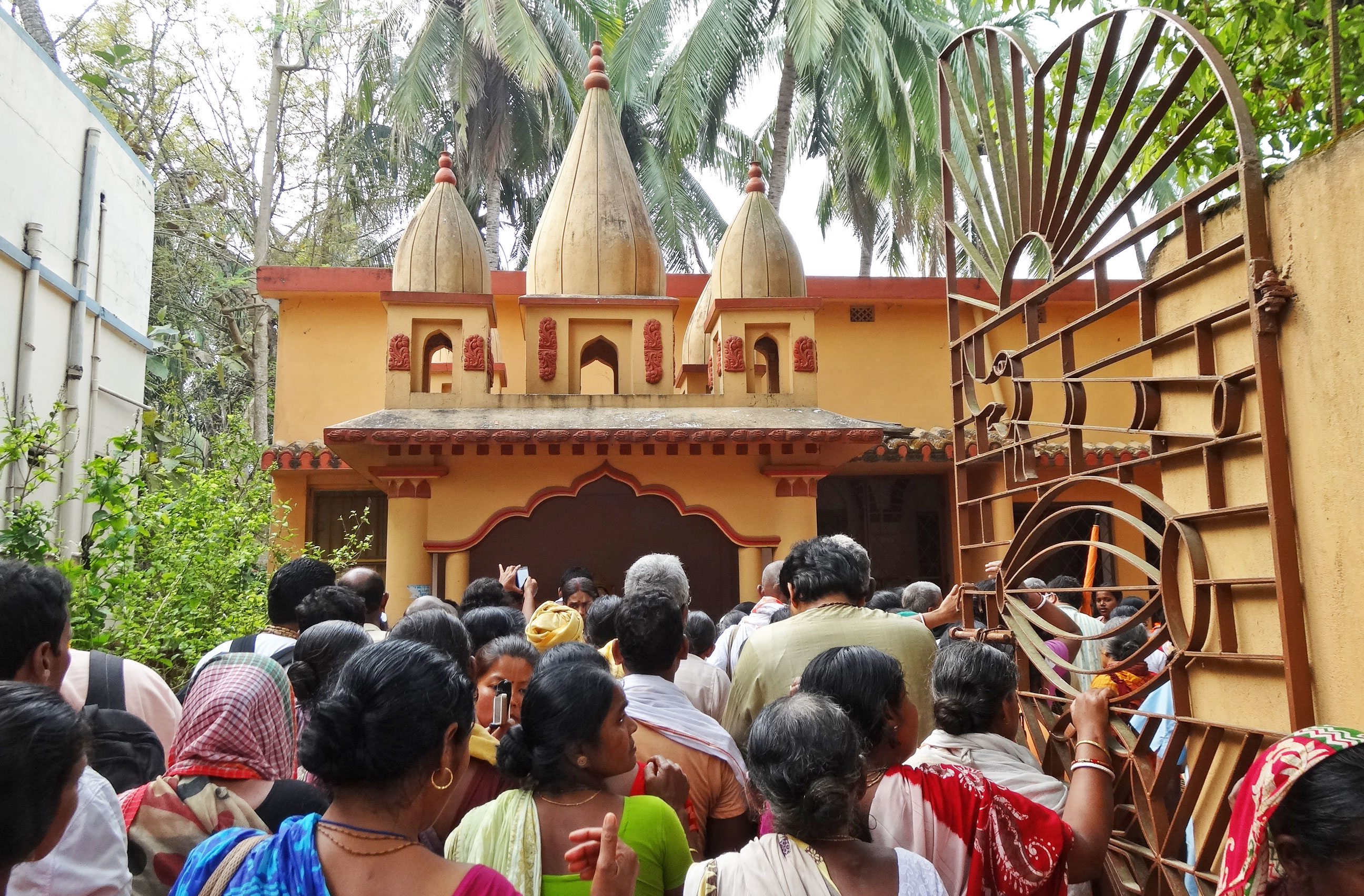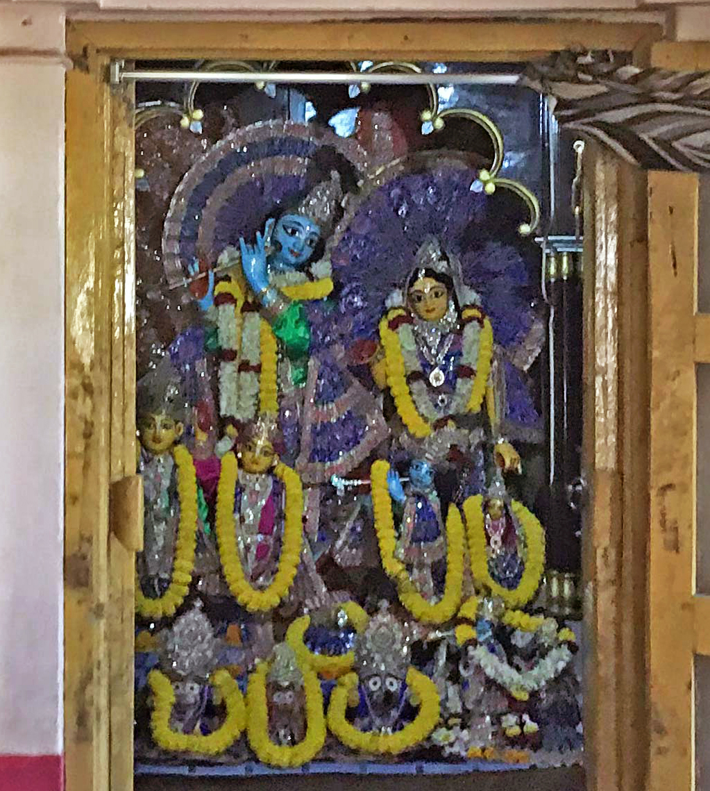 Continuing the parikrama of Sri Nabadwip Dham, we have now arrived at this very beautiful place, the temple of Sri Saranga Murari. A devotee called Sri Saranga Thakur used to live here, and later the temple became known as the temple of Sri Saranga Murari (Saranga Murari’s Math). Here is how it occurred. In olden days, there were many snakes in jungles, and many people died when they were bitten by a snake. (You can still see that during the rainy season, people go to a healer or a shaman to take out snake poison. It is practised to this day.) One day, a young boy was bitten by a snake in this village. The parents could not rescue him, so they put the dead body of their son on a raft and set it floating down the Ganges. In the meantime, there was also Sri Saranga Thakur who lived here. He had gone very old, and one day he came into his prayer room (his Deities, Sri Sri Radha-Gopinath, are still here at the temple) and prayed, ‘Dear Lord! What will happen now? I have gone so old, I cannot serve You properly anymore – I cannot offer You bhog, I cannot do all the services… Please send somebody who can take charge of Your service. I cannot do it anymore…’ The Lordships heard his prayer, and when Sri Saranga Thakur went to bed that night, They came to him in a dream and said, ‘Saranga, We will send one person to you. You must give him initiation and accept him as your disciple.’ ‘Yes, Prabhu. I will do that,’ Saranga Thakur answered. ‘How will I understand who that person is?’ ‘When you wake up and go to the Ganges to take a bath, give initiation to whoever you see first.’ After the Lord said this, the dream broke. The next day, Sri Saranga Thakur woke up and went to the Ganges to take a bath. When he came to the bank, he saw a banana-tree raft floating down the Ganges towards him – there was that boy’s dead body on it. Sri Saranga Thakur remembered what Gopinath had told him, so, following the order of the Lord, he spoke the mantra into the dead boy’s ear: ‘Hare Krishna Hare Krishna Krishna Krishna Hare Hare / Hare Rama Hare Rama Rama Rama Hare Hare.’ When this mantra entered the boy’s ear, the boy opened his eyes. He slowly got up and looked around him – seeing Sri Saranga Thakur, he offered him an obeisance, accepting him as his guru. Sri Saranga Thakur took a bath in the Ganges and took the boy to his temple. Since that time, the boy engaged himself exclusively in the service to his guru and the Deities. Meanwhile, the boy’s parents heard that their son had survived and was staying in a nearby village. They came to the temple and started to cry, ‘Dear son, you have not died! Sweetheart, please come with us, come. Let us go home!’ But the boy replied, ‘I will not go with you. You have thrown me into the Ganges, so I am not yours anymore. I am not your Murari – I am now Saranga’s Murari! I belong to my gurudev.’ When Sri Saranga Thakur left his body, Saranga Murari stayed here and continued serving. This is a very beautiful place: a place where Mahaprabhu’s associates lived. Coming here, we are remembering how powerful the Holy Name of Lord Krishna is – if it is the genuine Name, the result of chanting this Name is inconceivable.