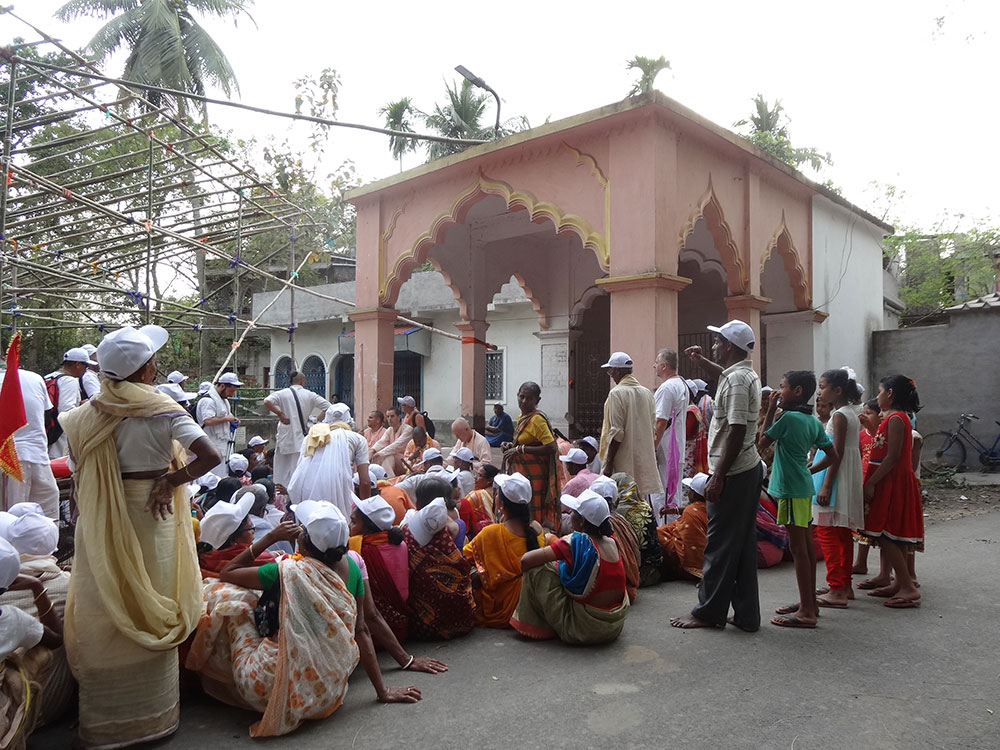 Continuing our parikrama path, we have crossed Sri Antardwip and have entered Sri Simantadwip. Srila Bhaktivinod Thakur describes the glory of this island in his holy book Sri Nabadwip Dham Mahatmya: Continuing Sri Nabadwip Dham parikrama, Sri Nityananda Prabhu and Sri Jiva Goswami Prabhu reached this village called Simuliya. Coming here, Sri Nityananda Prabhu told: This is definitely Simantadwip. Later, Ganga will capture this island and only this place here will remain visible. One day in Satya-yuga, Sivji Maharaj started dancing, chanting the Holy Name of Gauranga. Seeing his state, Parvati Devi (Sivji Maharaj’s spouse) asked him, ‘Why are you always calling out, “O Gauranga! O Gauranga!”? Who is this Gauranga? When I see you dance and hear the Name of Gauranga, it is melting my heart. I am thinking that whatever mantras, tantras, etc. I have heard before, it is all garbage for the soul! Tell me about Gauranga. I can feel that if I serve Him, I will gain life.’ Hearing Parvati’s words, Mahadev said, ‘As you are the primaeval energy, part of Sri Radha, I will tell you everything openly. In Kali-yuga, Krishna will take Radha’s heart and halo and appear in a village called Mayapur. Intoxicated with the joy of kirtan, He will distribute the jewel of transcendental love to everyone without any discrimination. Remembering the promise of the Lord makes me feel overwhelmed with transcendental love. Unable to steady my mind, I left Kashi and came to Mayapur, where I then decided to worship Gauranga in a small hut on the bank of the Ganges.’ Hearing Sivji Maharaj’s words, Parvati Devi came to Simantadwip and started meditating on Sri Gauranga’s form. As she chanted and chanted the Holy Name of Gauranga, transcendental love sprang up in her heart. She could no longer control her mind. In the end, Gaura appeared in front of her together with His devotees. He asked her, ‘Parvati, what do you want? Why have you come here?’ Anxiously, Parvati Devi offered her obeisance at the Lord’s holy lotus feet and spoke in reply, ‘Prabhu, You are the life and soul of the world, you my Prananath, the Master of my very being. You are bestowing Your mercy, love and affection all over the world, but You are so cruel to me! You have given me such a cruel service: I am to bind the souls who are averse to you. I am doing what You told me to do, but I myself am cheated out of Your mercy! People say that wherever there is Krishna, there is no place for Maya (Maya cannot stay there): I have become completely separated from You. When and how will I be able to see Your pastimes? If You do not tell me how to reach You, I will lose all hope.’ Saying this, Parvati took some dust from the holy feet of Gauranga and rubbed it onto the parting of her hair (simanta). From that time, this place became known as Simantadwip, although ignorant people still call it Simuliya-gram. In reply to Parvati’s words, Mahaprabhu said, ‘Parvati, you are My non-different energy. You are the Mistress of the whole world, and you always stay with Me. You have two forms: by your intrinsic nature, you are My Radhika, and externally, you are an expansion of Radha. My pastimes are not possible without you. You are always present in My pastimes as Yogamaya. In Vraja, you perform your eternal pastimes as Paurnamasi, and in Nabadwip, you live with Ksetrapal (the guardian of the dham) Sivji Maharaj as Praudha Maya.’ Saying this, Mahaprabhu disappeared. Ever since that time, always keeping these words in her heart, Parvati Devi has been staying as Simantini Devi in Simantadwip and as Praudha Maya in Mayapur. Such is the glory of Sri Simantadwip.