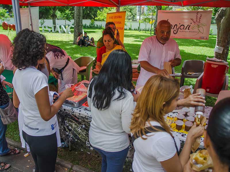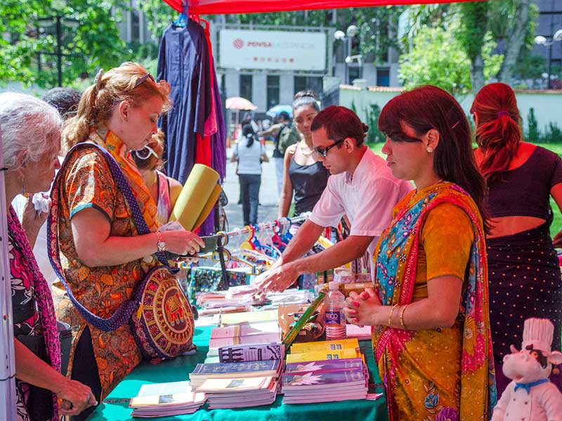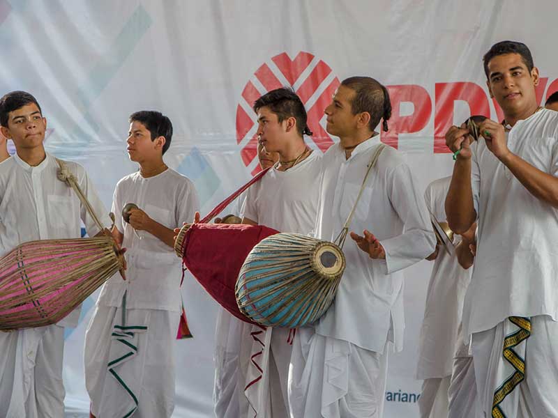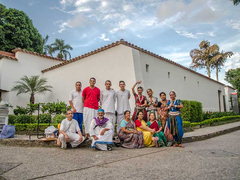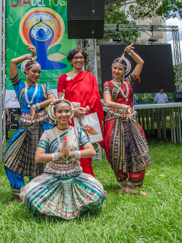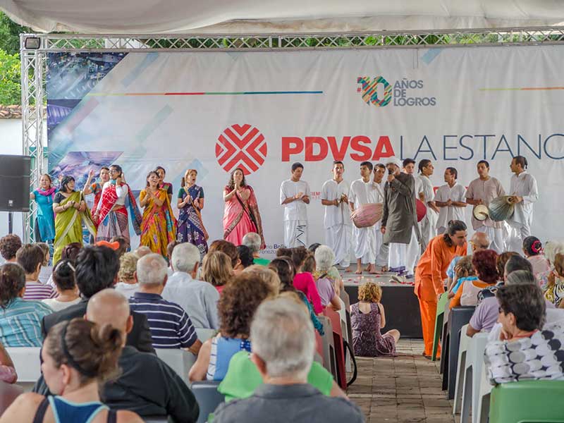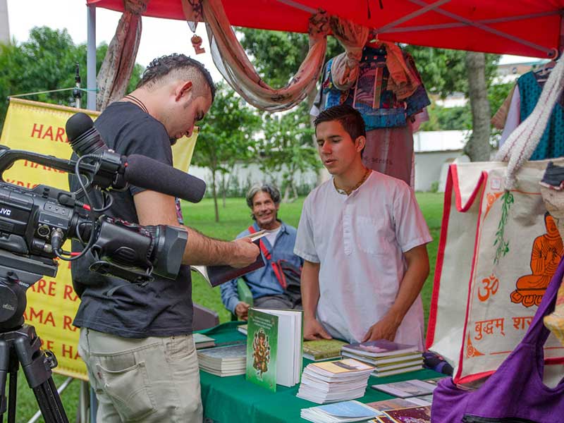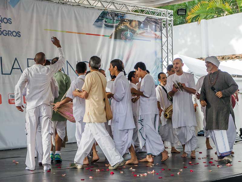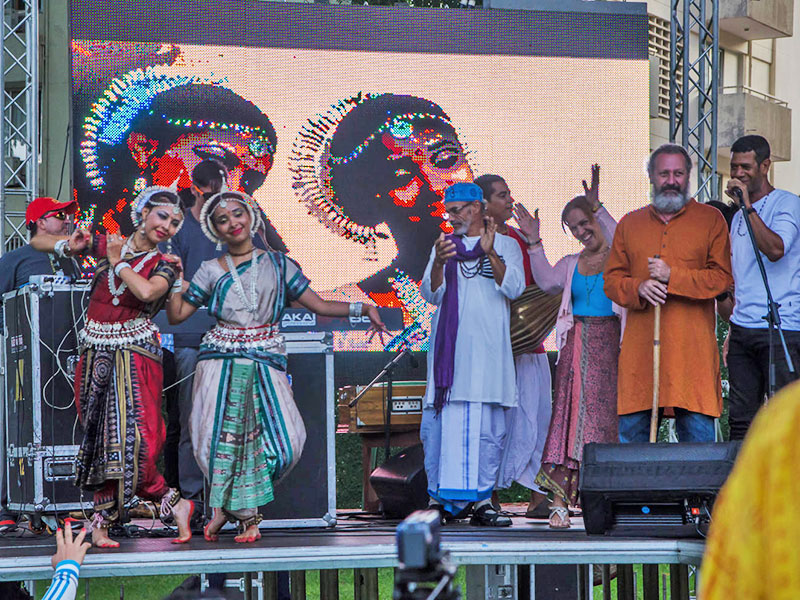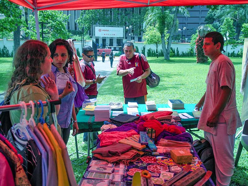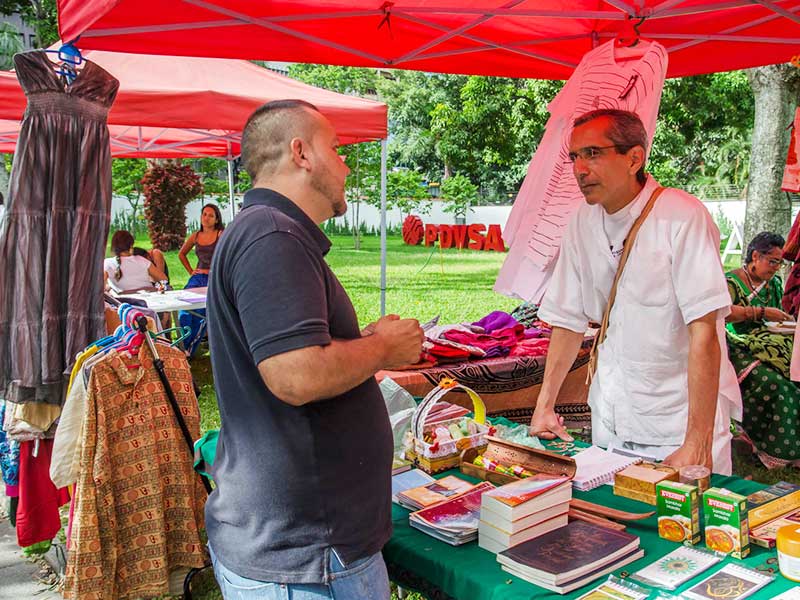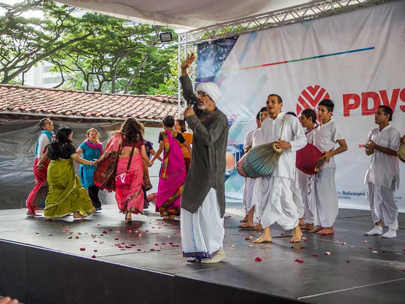 For three days from 19 to 21 June the devotees from Venezuela and Colombia participated in the International Festival of Yoga held yearly in Caracas, Venezuela, representing and preaching on behalf of Sri Chaitanya Saraswat Math. Sripad Hari Kirtan Prabhu was one of the organisers of the festival and through him the devotees could take a prominent part and preach extensively through the Odissi dances, kirtans, books, as well as stalls with ethnic clothing and various savouries. This festival also was a very good opportunity to gain TV coverage and promote Sri Chaitanya Saraswat Math among such influential personalities as the ambassadresses of India (Smita Purushottam), Malaysia, Thailand, Singapore, and others. Sending these pictures, the devotees write: "Hari Kirtan Prabhu invited us to participate [in this festival] as his offering to Srila Acharya Maharaj, and we are very happy to offer this seva and our dandavat pranams to the lotus feet of our dearmost Srila Acharya Maharaj and to all the devotees of Sri Chaitanya Saraswat Math family."