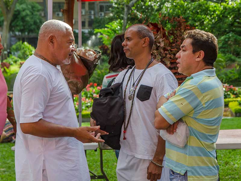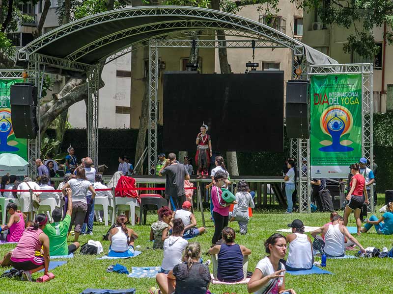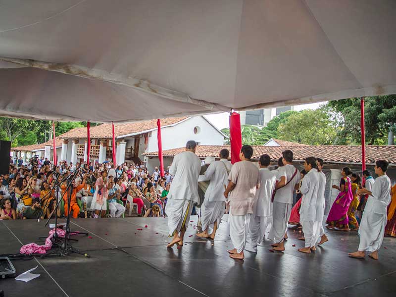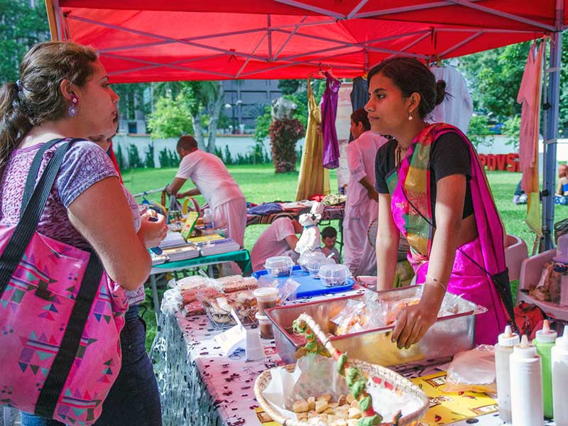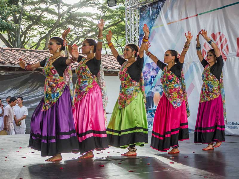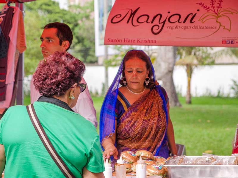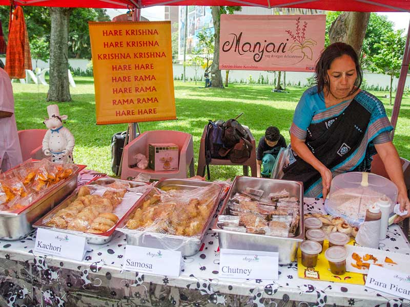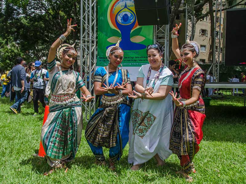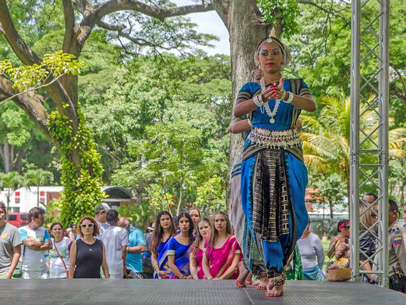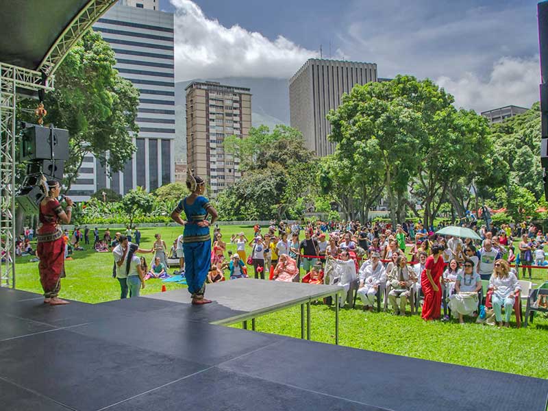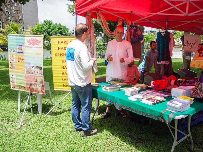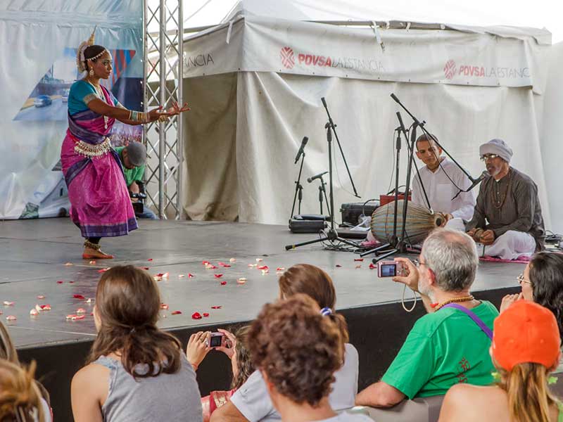 For three days from 19 to 21 June the devotees from Venezuela and Colombia participated in the International Festival of Yoga held yearly in Caracas, Venezuela, representing and preaching on behalf of Sri Chaitanya Saraswat Math. Sripad Hari Kirtan Prabhu was one of the organisers of the festival and through him the devotees could take a prominent part and preach extensively through the Odissi dances, kirtans, books, as well as stalls with ethnic clothing and various savouries. This festival also was a very good opportunity to gain TV coverage and promote Sri Chaitanya Saraswat Math among such influential personalities as the ambassadresses of India (Smita Purushottam), Malaysia, Thailand, Singapore, and others. Sending these pictures, the devotees write: "Hari Kirtan Prabhu invited us to participate [in this festival] as his offering to Srila Acharya Maharaj, and we are very happy to offer this seva and our dandavat pranams to the lotus feet of our dearmost Srila Acharya Maharaj and to all the devotees of Sri Chaitanya Saraswat Math family."