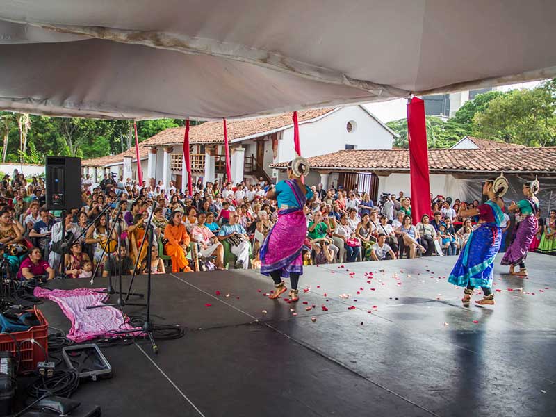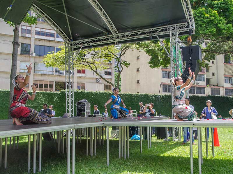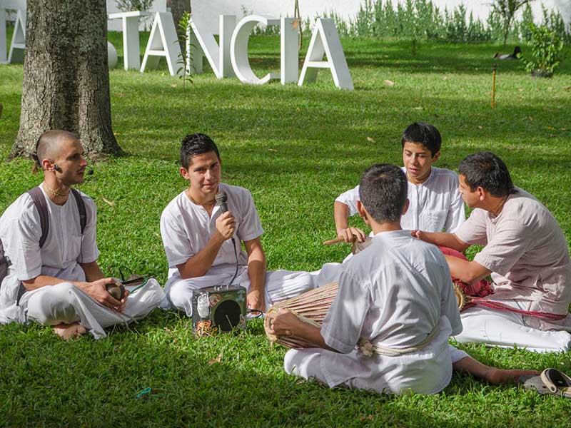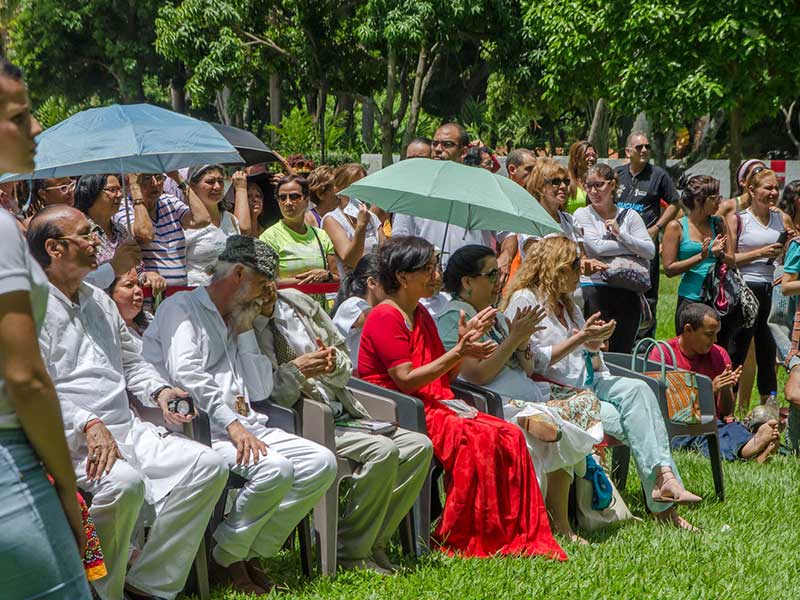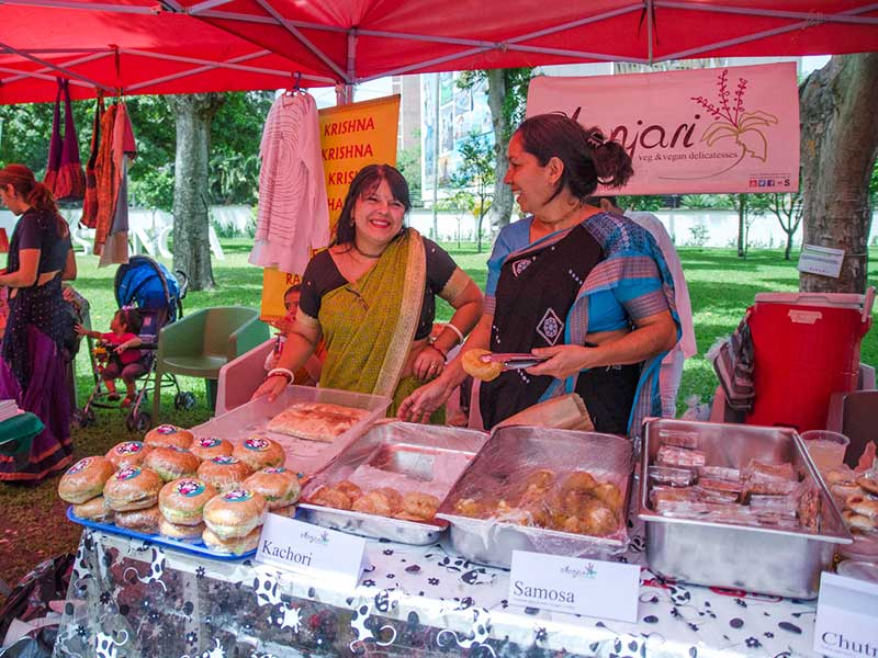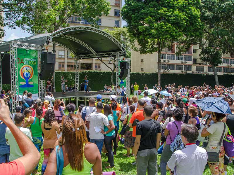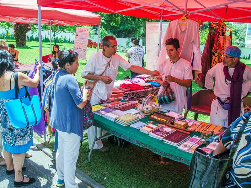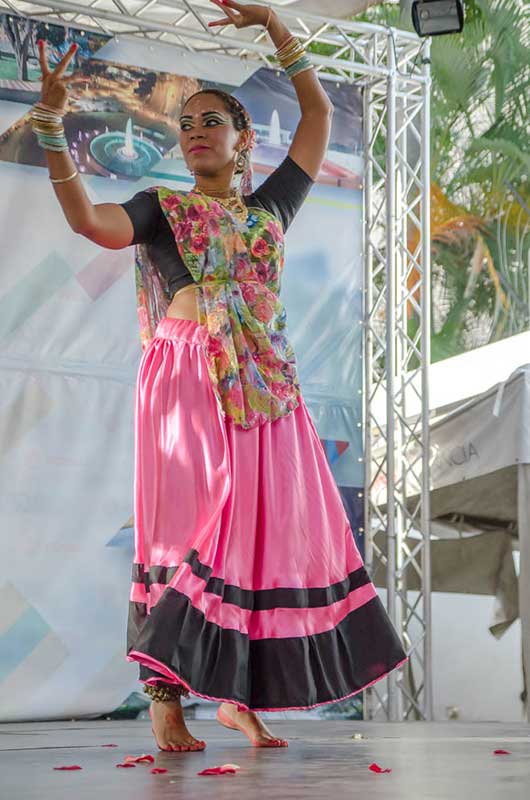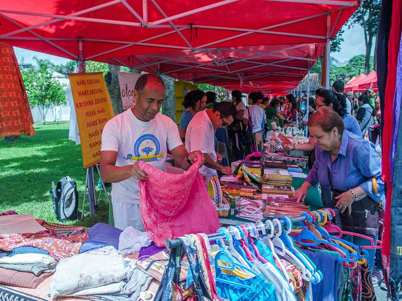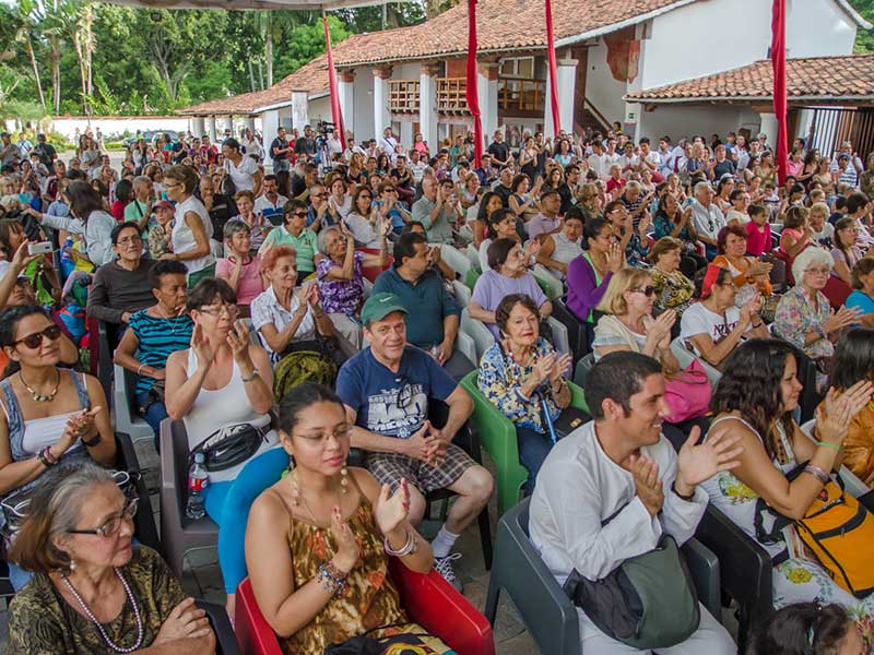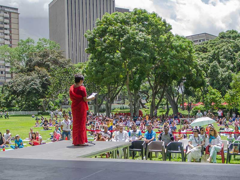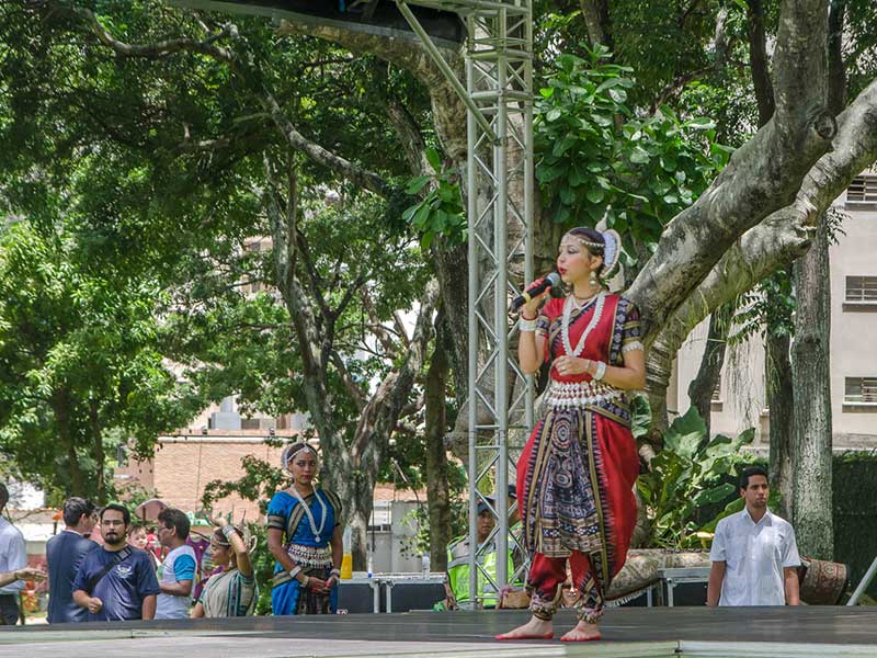 For three days from 19 to 21 June the devotees from Venezuela and Colombia participated in the International Festival of Yoga held yearly in Caracas, Venezuela, representing and preaching on behalf of Sri Chaitanya Saraswat Math. Sripad Hari Kirtan Prabhu was one of the organisers of the festival and through him the devotees could take a prominent part and preach extensively through the Odissi dances, kirtans, books, as well as stalls with ethnic clothing and various savouries. This festival also was a very good opportunity to gain TV coverage and promote Sri Chaitanya Saraswat Math among such influential personalities as the ambassadresses of India (Smita Purushottam), Malaysia, Thailand, Singapore, and others. Sending these pictures, the devotees write: "Hari Kirtan Prabhu invited us to participate [in this festival] as his offering to Srila Acharya Maharaj, and we are very happy to offer this seva and our dandavat pranams to the lotus feet of our dearmost Srila Acharya Maharaj and to all the devotees of Sri Chaitanya Saraswat Math family."