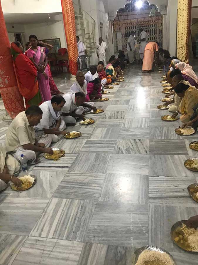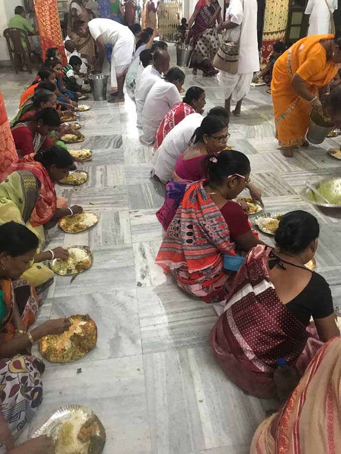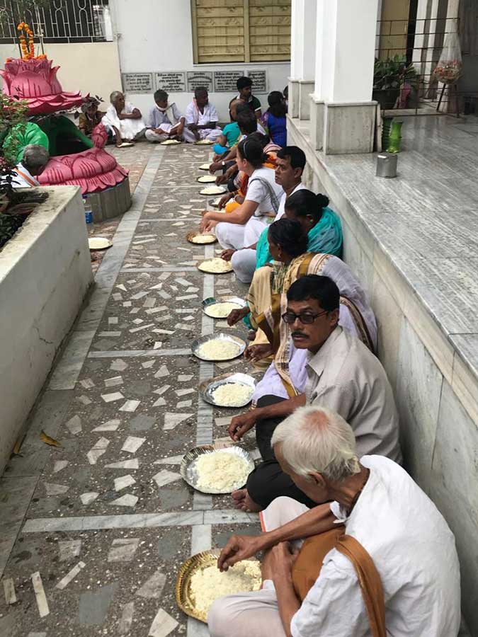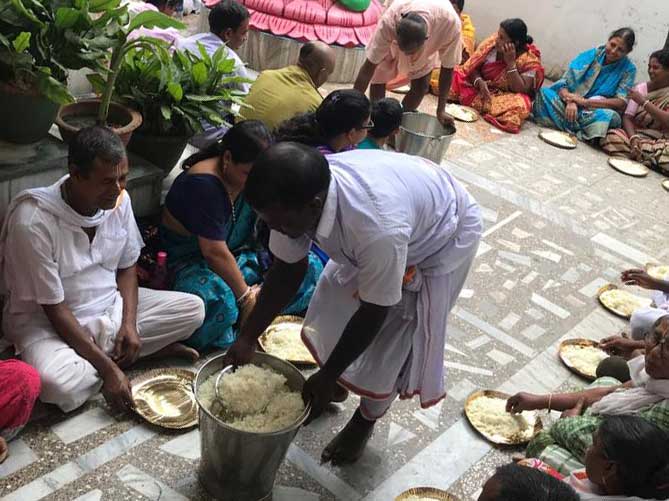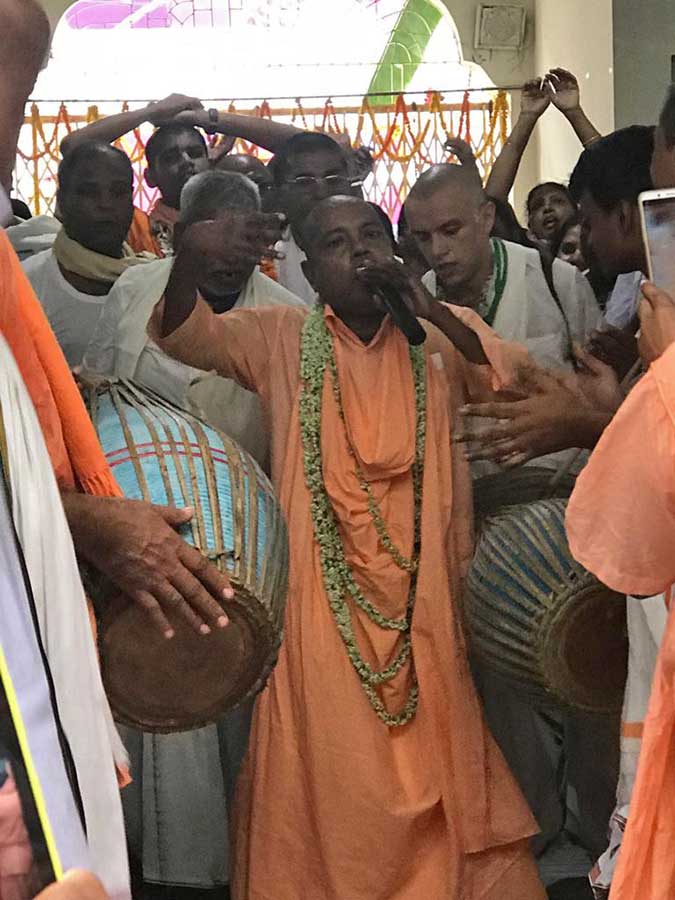 Having honoured the offering of the devotees, His Divine Grace is handing a piece to Sripad Santa Maharaj.
