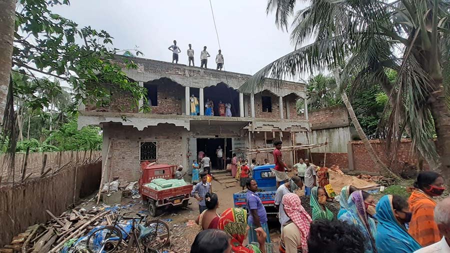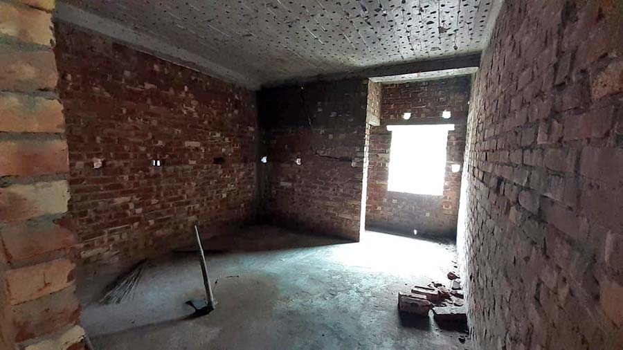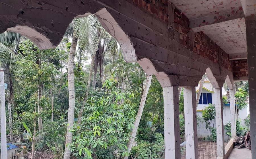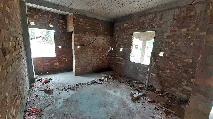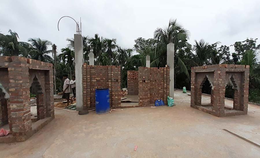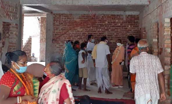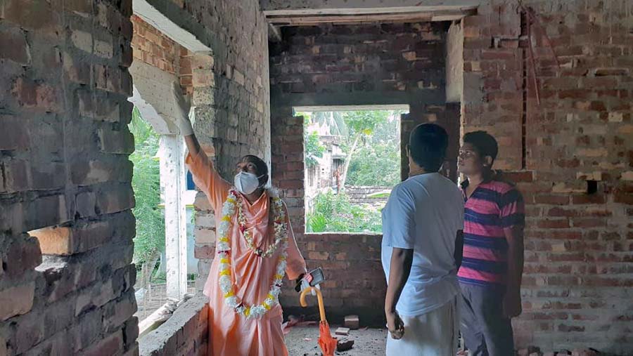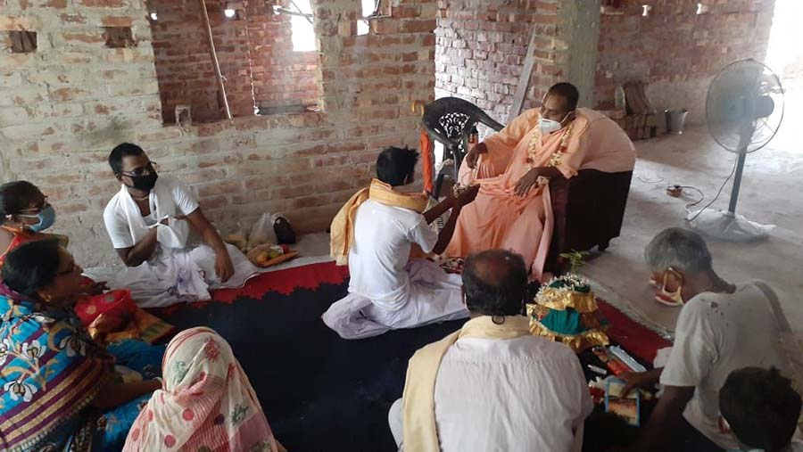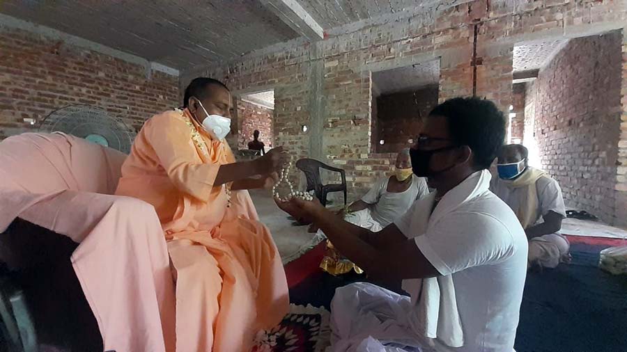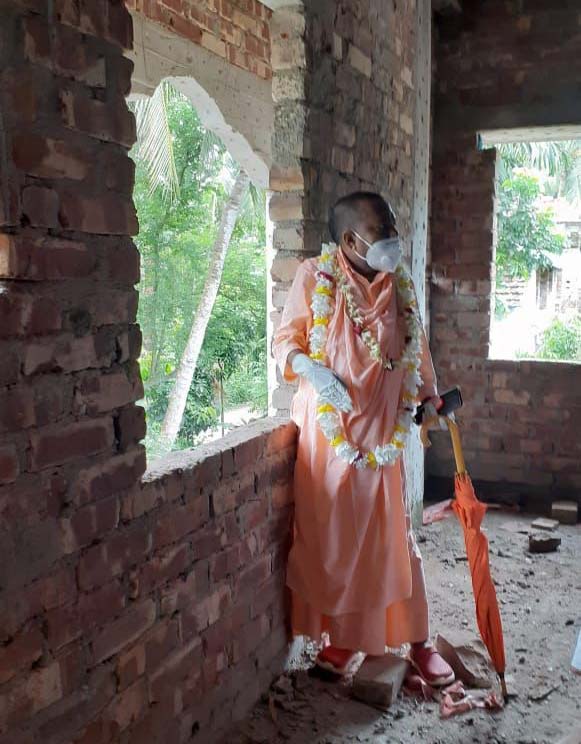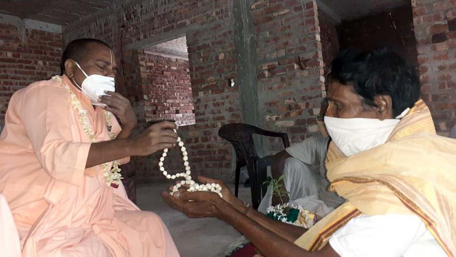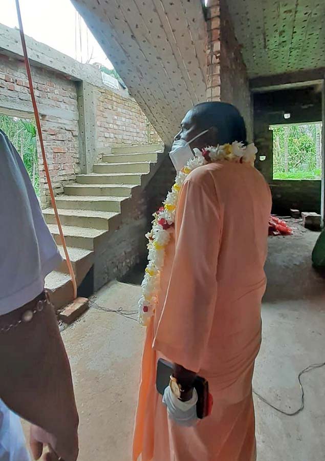 Having finished the check-up on the construction, His Divine Grace mercifully welcomes new members of Sri Chaitanya Saraswat Math family by bestowing to them initiation into the chanting of the Holy Name.