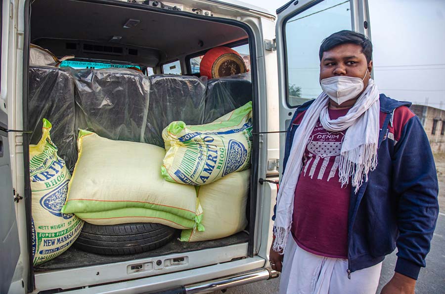 Most of the collected rice will be collected later by trucks and some small quantities of rice are collected at the same time.