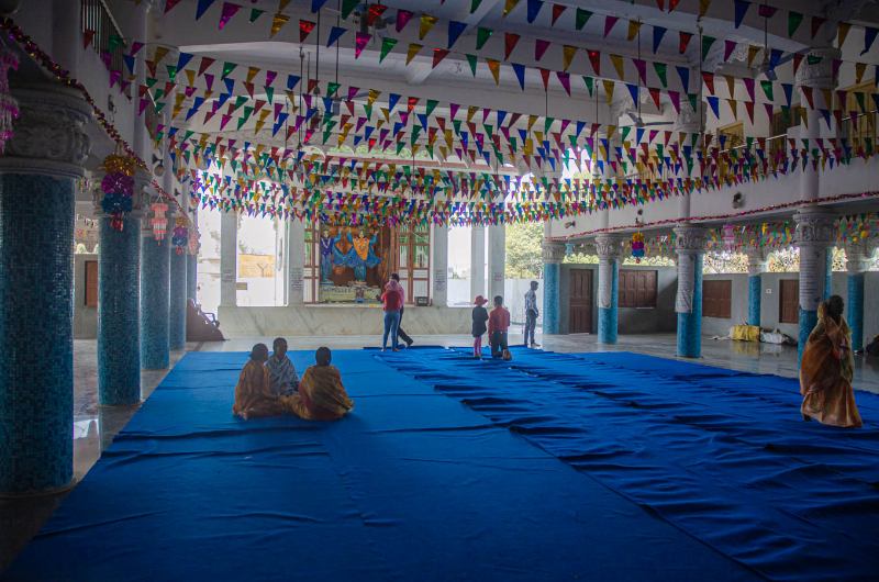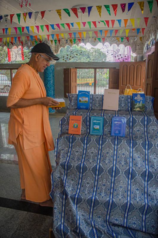 ...while Sripad Sajjan Maharaj arranges a stall at the front of the nat mandir.