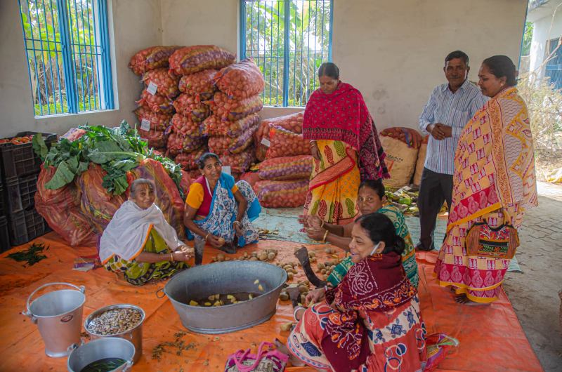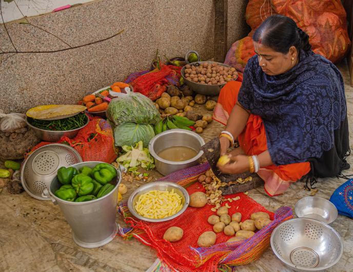 Devotees peeling and cutting potatoes for the noon bhoga offering...