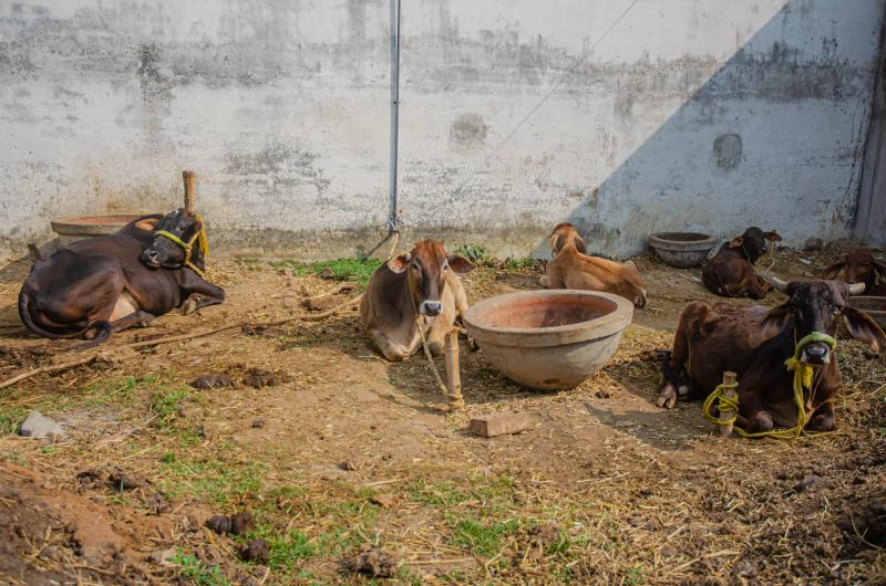 The cows relax outside in the warm sunlight.