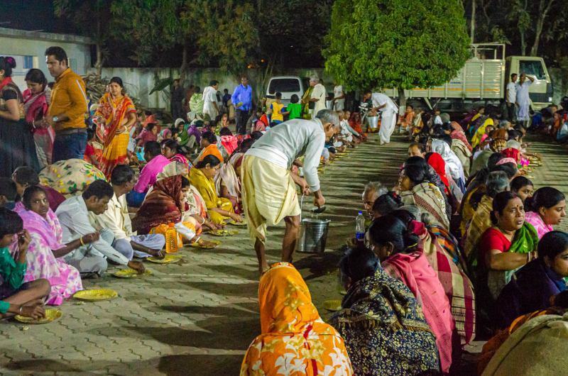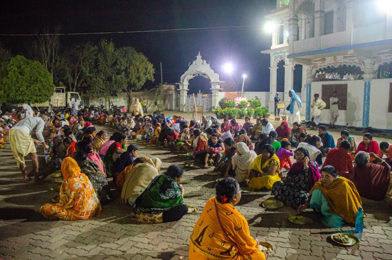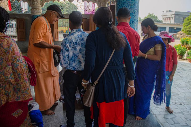After the class, devotees sit in the courtyard of the Lordships and honour the mahaprasadam, the holy remnants of the food taken by the Lord.