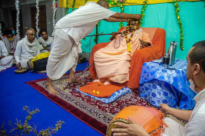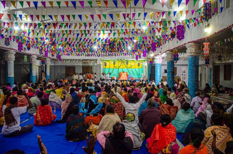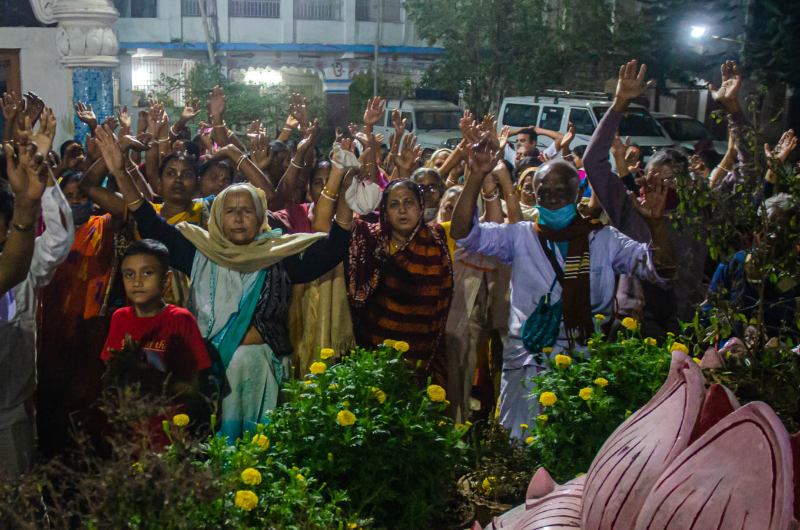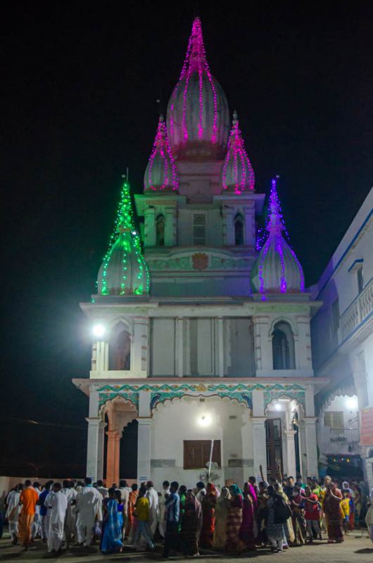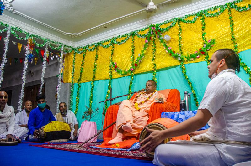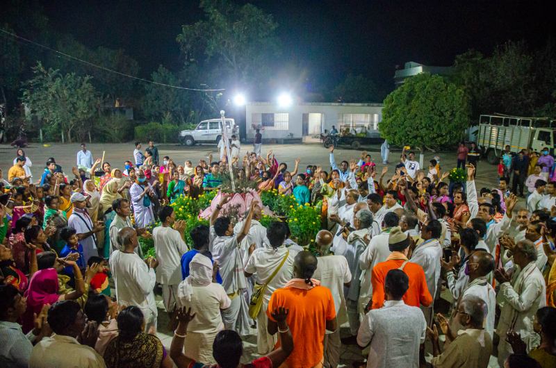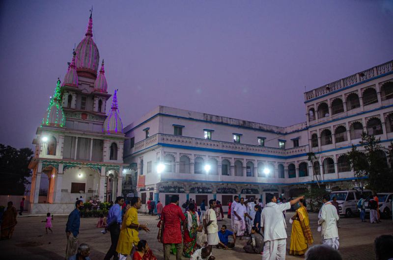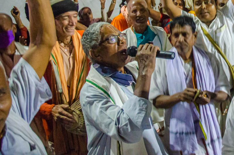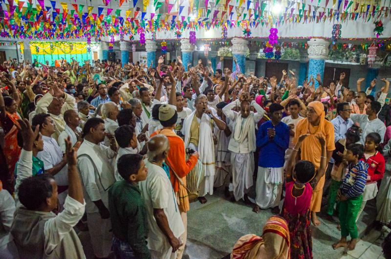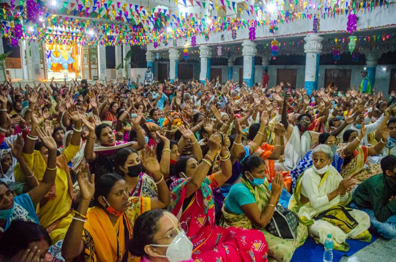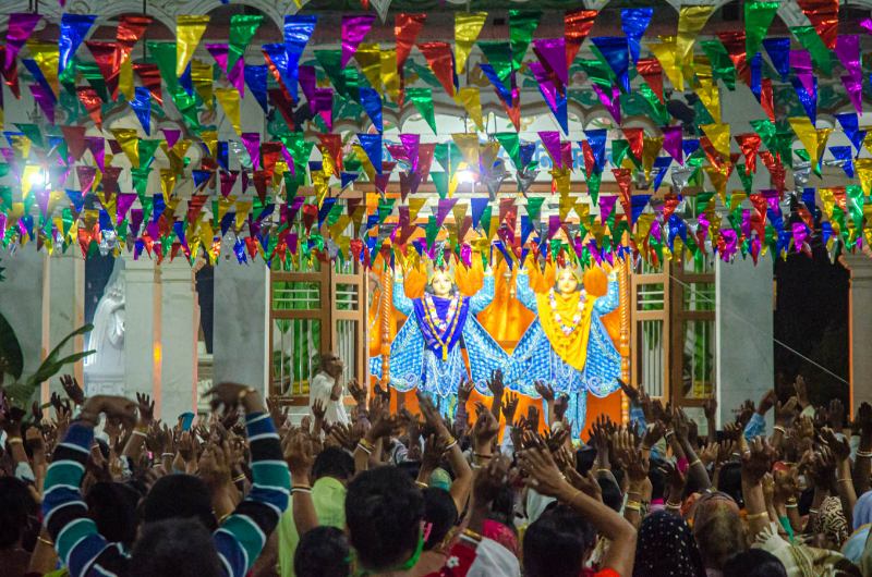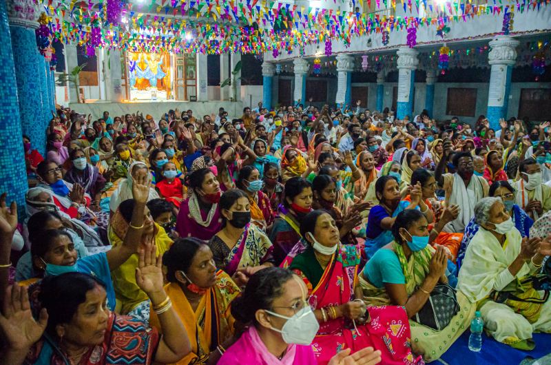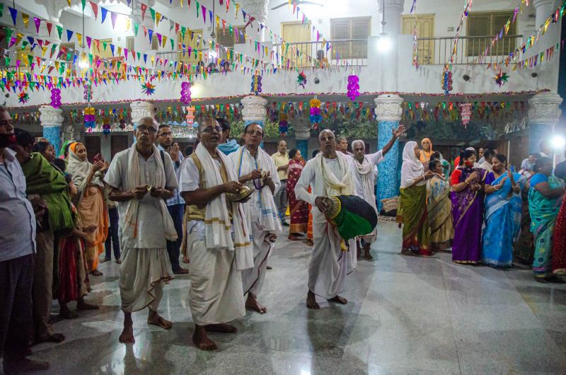 As the sun sets, devotees assembled in the nat mandir to chant the glories of the Lord during the holy evening arati of the Lordships.
