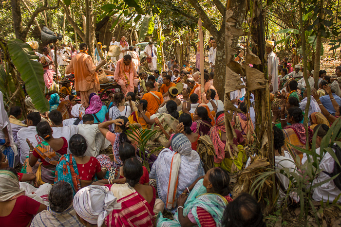 Продолжая парикраму Шри Навадвип-дхамы, мы пересекли Шри Ритудвип и пришли сейчас в Шри Джахнудвип. На этом острове нет храма, но мы останавливаемся ненадолго в лесу Шри Джахнудвипа. Здесь мы сидим и беседем о славе острова. Этот чарующий лес — Бхадраван, расположенный во Вриндаван-дхаме. В древние времена великий мудрец по имени Джахну жил здесь и долгое время практиковал аскезы, благодаря чему он обрёл даршан Гауранги Махапрабху. Когда мы были в Ганганагаре, мы говорили о Ганге и рассказывали о том, как Бхагиратх Махарадж вёл Гангу Деви к океану для того, чтобы спасти своих предков. Однажды вечером, когда Джахну Муни сидел здесь, сосуд, который он использовал для поклонения Господу, упал в Гангу, и быстрое течение реки стремительно унесло его прочь. Увидев это, Джахну Муни выпил Гангу досуха. Тем временем Бхагиратх Махарадж заметил, что Ганги нигде нет. Он повсюду искал её и в конце-концов понял, что произошло. Он пришёл к Джахну Муни и со всем смирением объяснил ему ситуацию, но Джахну Муни ничего не ответил. Тогда Бхагиратх Махарадж остался здесь и начал поклоняться и медитировать на мудреца в надежде снискать его милость. Спустя долгое время Джахну Муни сжалился над царём: он вспорол себе бедро и выпустил Гангу Деви. Так Ганга Деви стала известна под именем Джахнави («рождённая от Джахну»). Много лет спустя, в двапара-югу, сюда приходил сын Ганги Деви Бишмадев, чтобы встретиться с мамой. Увидев своего дорогого сына, Джахнави Деви встретила его с большой заботой и любовью и отвела домой к своему отцу Джахну Муни. Бхишмадев долгое время прожил в ашраме Джахну Муни и учился у мудреца дхарме (позже он передал это учение Юдхиштхиру Махараджу). Благодаря тому, что Бхишмадев жил на острове Шри Джахнудвип в Шри Навадвип-дхаме, он обрёл сокровище преданности и стал великим вайшнавом. Такова слава этого прекрасного острова Шри Джахнудвип.