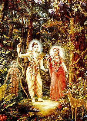 — Прабху, почему Ты улыбаешься? — О Деви, — ответил Господь Рамачандра, — это большая тайна. Когда придёт кали-юга, все души увидят здесь, в Надии, Мой золотой облик. Я появлюсь в доме Шри Джаганнатха Мишры и Шачи Деви в облике Гауранги и освобожу весь мир. Удачливые души смогут увидеть Мои детские игры и обрести трансцендентную преданную любовь. Наслаждаясь связанными со знаниями трансцендентными играми, Я открою этому миру славу Святого Имени. Затем Я приму санньясу и уйду в Нилачалу, а Моя жена будет плакать на коленях у мамы. — Зачем Ты заставишь плакать свою маму? Зачем Ты примешь санньясу и причинишь так много боли жене? Какое Тебе от этого счастье? Я не понимаю. — Дорогая Моя, — ответил Господь, — ты всё знаешь. Ты спрашиваешь сейчас Меня об этом, претворяясь, что не знаешь, лишь для того, чтобы научить обусловленные души этого мира. Тот, кто питает ко Мне трансцендентную любовь, испытывают вкус этой любви двумя путями: в Моём присутствии или в Моём отсутствии. Счастье, которое душа испытывает в Моём непосредственном присутствии, называется единением (самбхогой), а счастье, которое душа испытывает, когда находится вдали от Меня, называется разлукой (випраламбхой). Вечные преданные, которые мечтают обрести по Моей милости единение со Мной, испытывают счастье горя в агонии разлуки. Разлука со Мной приносит огромную радость. Преданные это понимают. Когда после разлуки наступает единение, такое счастье становится во много раз сильнее из-за разлуки. Мама (Каушалья Деви) станет в кали-югу Шачи Деви, а ты будешь служить Мне в облике Вишнуприи. В трета-югу в агонии разлуки с тобой Я изготовлю твоё золотое божество и буду поклоняться ему в Айодхье, а ты в свою очередь тоже в агонии разлуки со Мной изготовишь Моё золотое божество в Надии и будешь тоже поклоняться Мне каждый день. Дорогая Моя, всё это сокровенные тайны, не рассказывай об этом никому. Эта обитель Навадвип-дхамы дороже всего для Меня: ни одного другое место в мире, даже Айодхья, не дороги Мне так, как Навадвип-дхама. Нашей хижины Рамават не останется в кали-югу, но она всегда будет существовать здесь в непроявленном виде. По воле Господа Гухака, преданный и друг Шри Рамачандры, родился здесь на острове Шри Модадрумдвип в Шри Навадвип-дхаме в доме брахмана. Его звали Садананда Випра Бхаттачарья, и он не знал ничего в этом мире, кроме Господа Рамы. Когда Махапрабху появился на свет, Садананда Випра был в это время у Джаганнатха Мишры дома. Он видел, что в дом пришло множество полубогов, и понимал, что родился сам Всевышний Господь. Вне себя от счастья он вернулся к себе домой и стал медитировать на божество, которому поклонялся. Вдруг он увидел перед собой Гаурасундара: Шри Гауранга Рай сидел на царском троне, а Брахма и другие боги опахивали Его чамарами. Затем рядом с Махапрабху он увидел Рамачандру, справа от которого стоял Лакшман, слева Сита Деви, а перед Ним — Хануман. Увидев это, он понял, что Рамачандра пришёл в кали-югу в облике Гауры. Он начал беспрестанно повторять: «Как же мне повезло! Как же мне повезло!» Позже, когда Гауранга Махапрабху проявил санкиртана-лилу, Садананда Випра танцевал с Ним, воспевая Святое Имя Гауры. Рассказывая об этих удивительных играх Шриле Дживе Госвами Прабху, Шриман Нитьянанда Прабху показал ему Шри Бхандираван, а затем, продолжав путь, они пришли в д